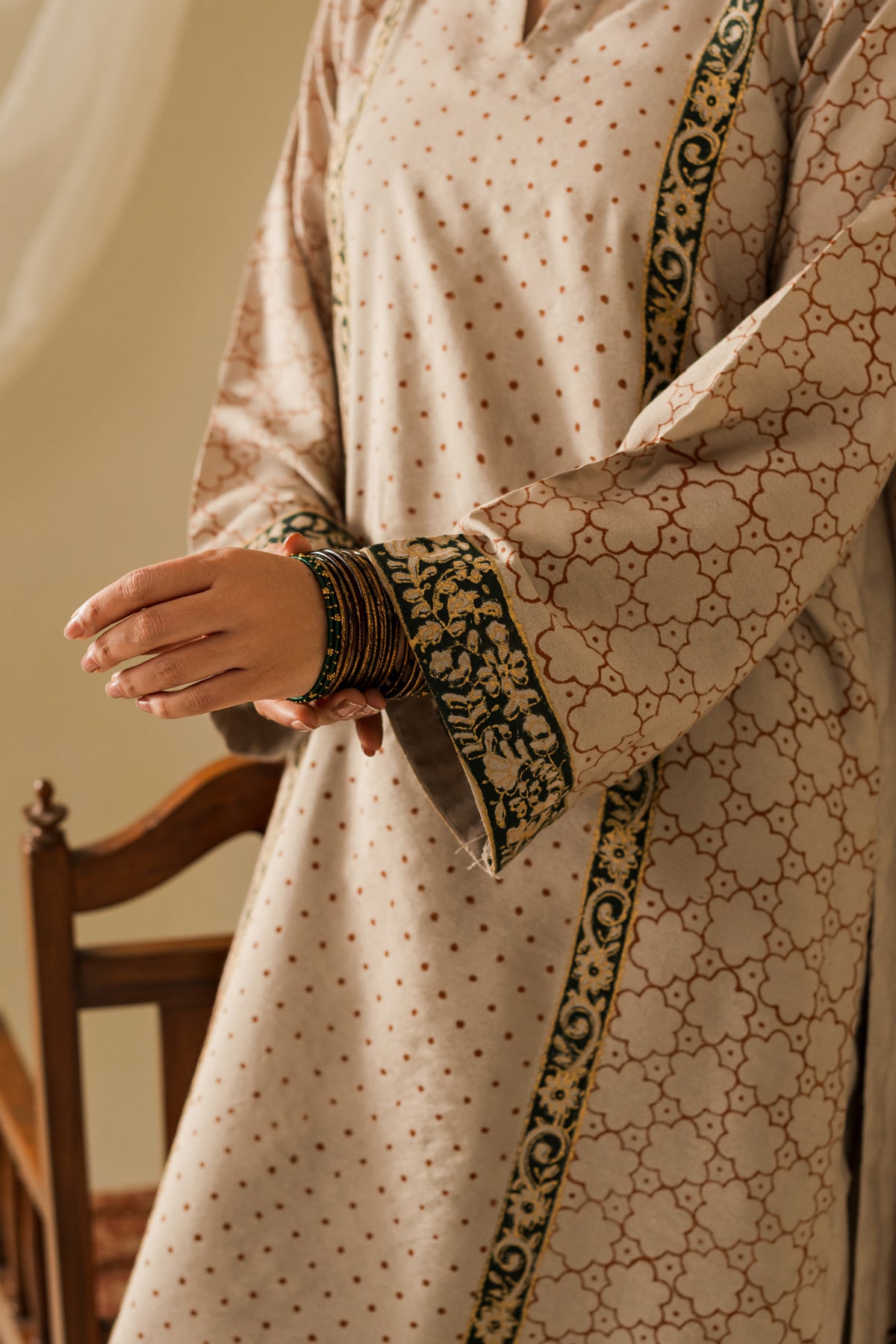 Fasana-e-Zar is a tale of quiet opulence. Woven in soft neutrals and deep accents, its intricate prints echo the artistry of heritage halls and gilded memories.