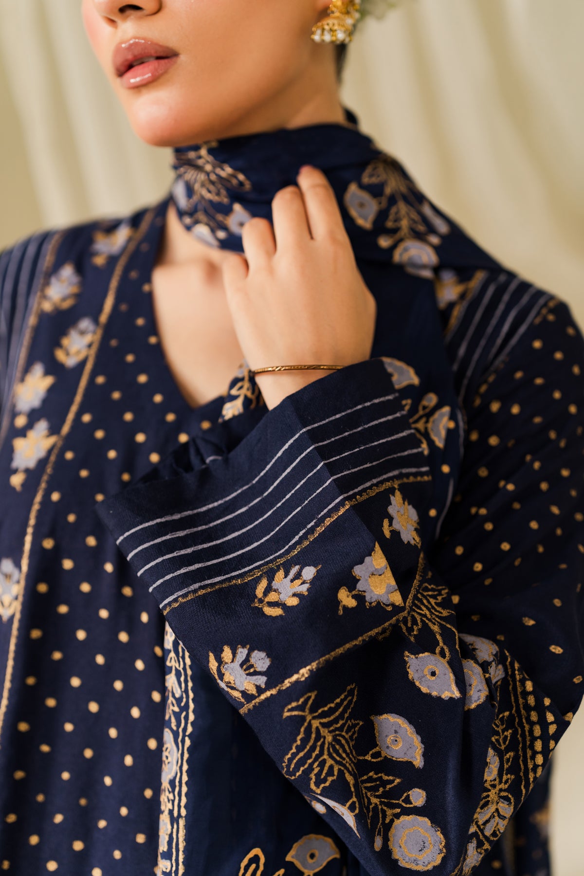 Gold block motifs shimmer softly against midnight blue - regal yet restrained.