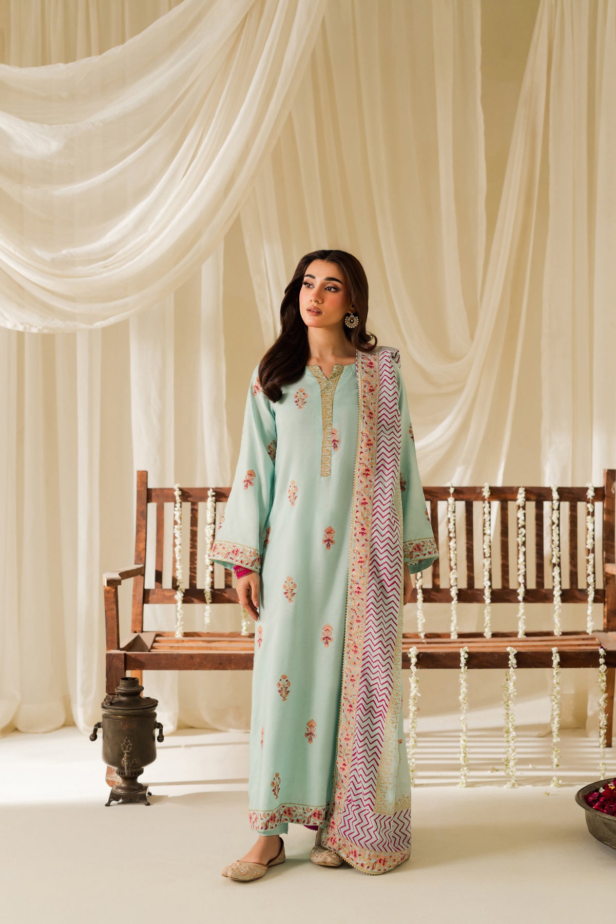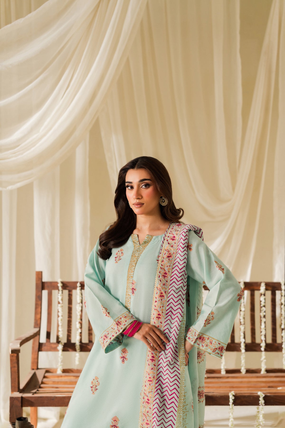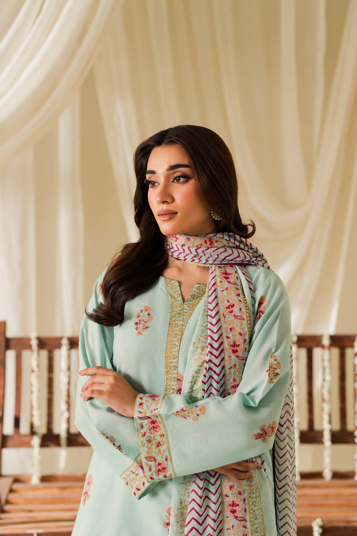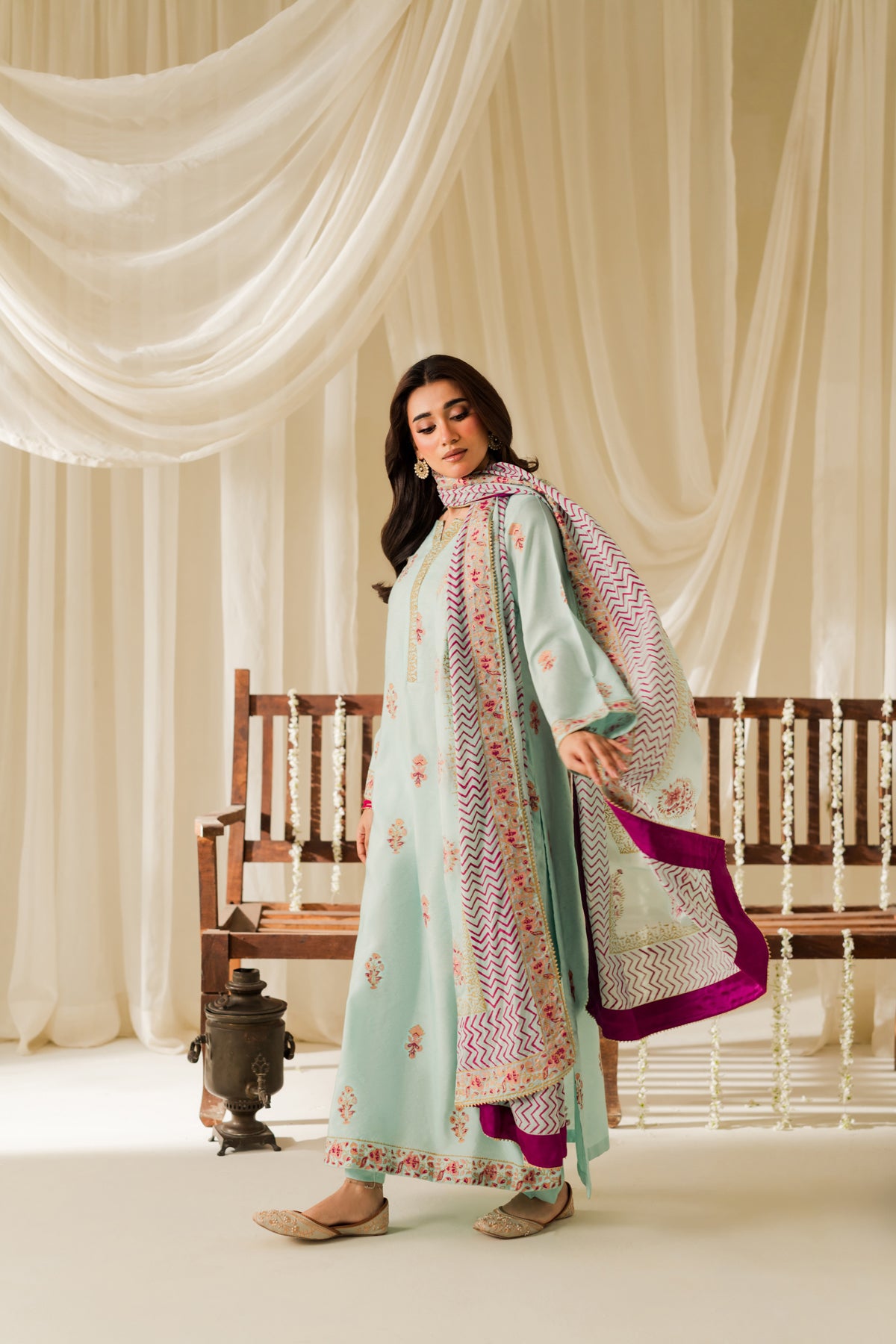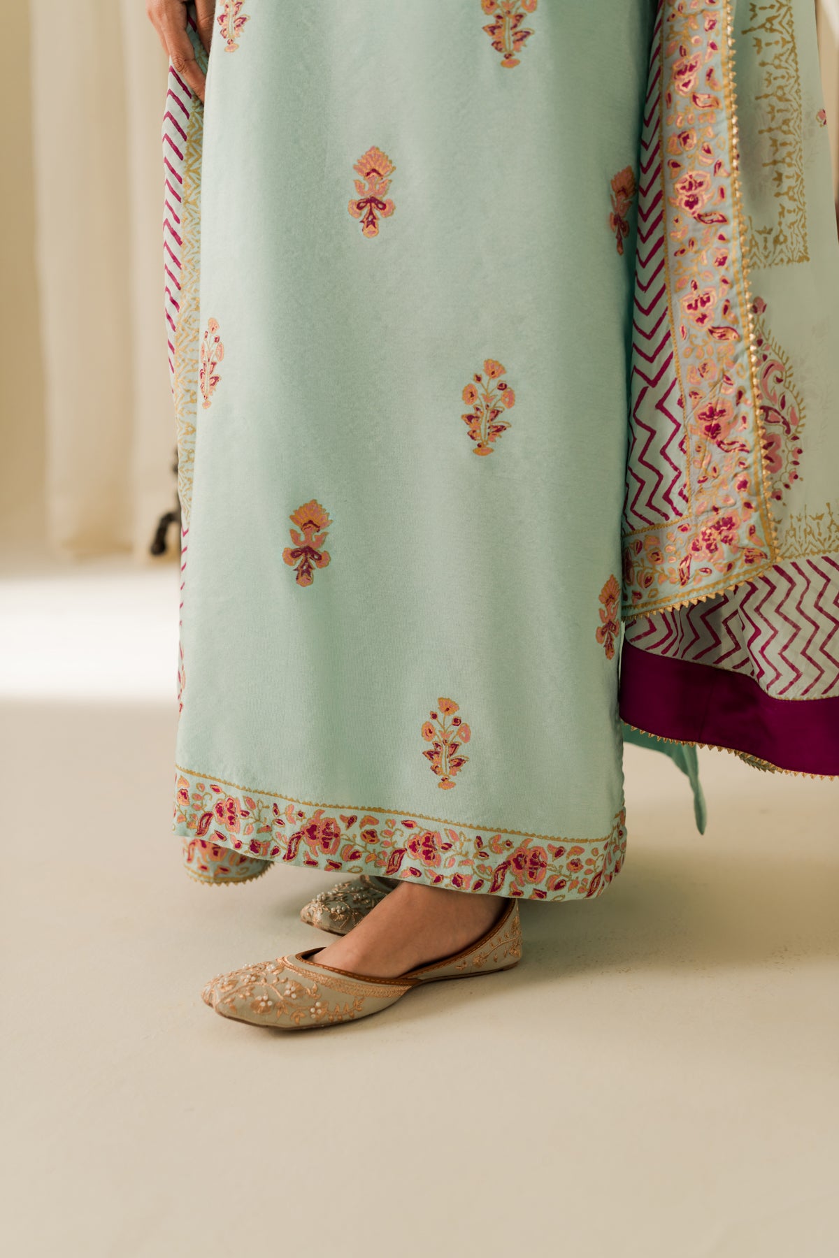 Hand block florals bloom gently over a mint canvas, while the dupatta adds a playful whisper of celebration.